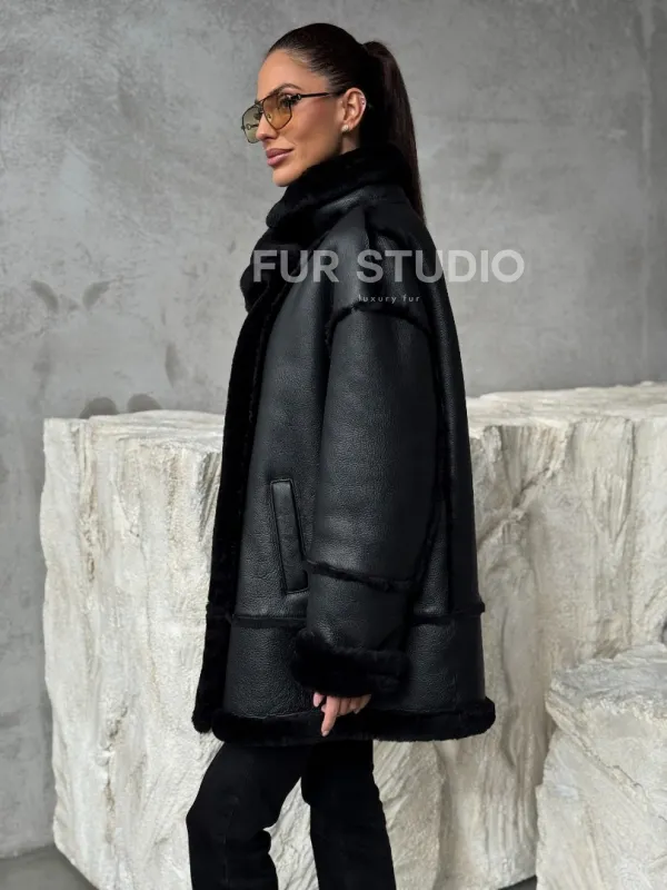 Черная современная дубленка. Модель предлагается в размерах от 44 до 48. Оптимальная длина моделей 75-80 см подчеркивает линии вашей фигуры. Эта дубленка станет неотъемлемой частью гардероба для тех, кто предпочитает роскошь и утонченность натуральной кожи.