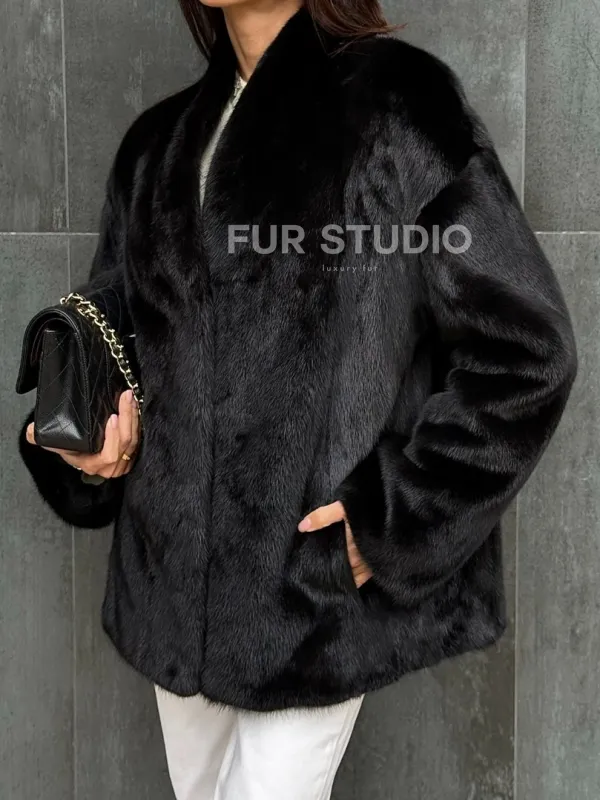 Черный норковый полушубок V-образный воротник 102419