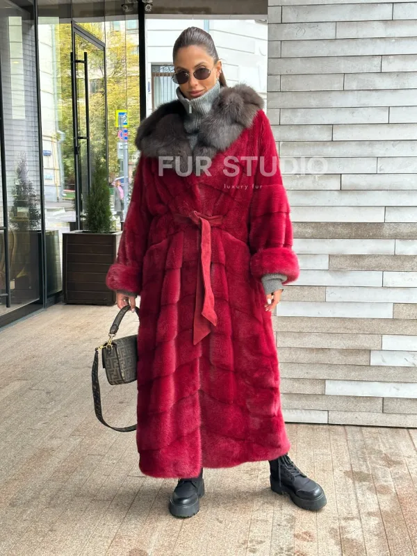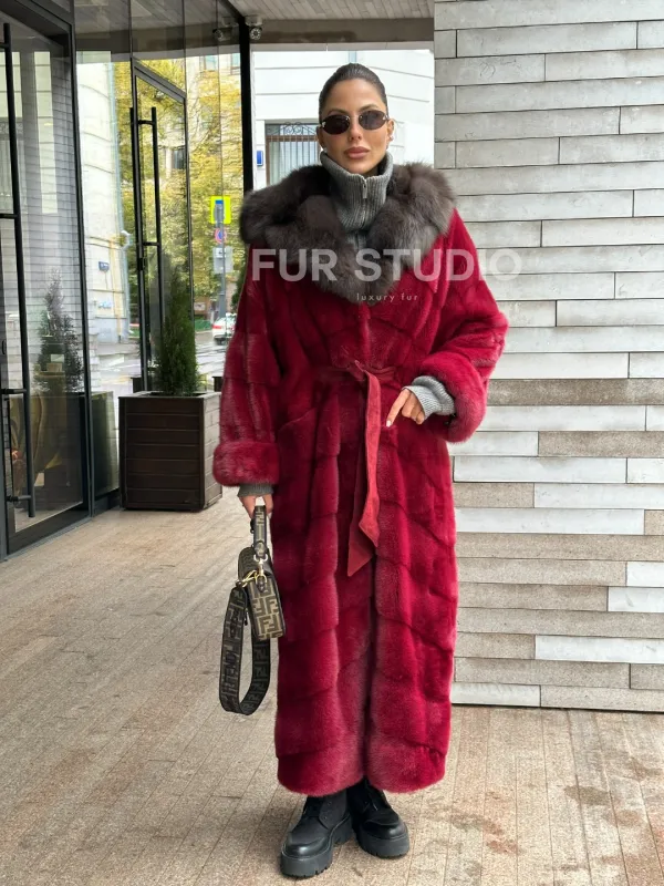 Мех данной шубы аукционная норка, цвет бордовый. Предлагается в размерах от 40 до 50. Длина модели 125-130 см, что выгодно подчеркивает фигуру девушек. Эта модель идеально подойдет для девушек и женщин, предпочитающих роскошные натуральные меха.