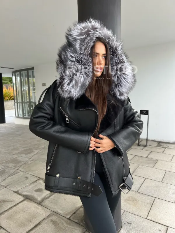 Дубленка - косуха с капюшоном из меха чернобурой лисы 100299
