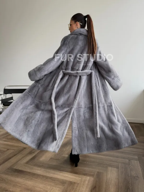 Мех данной шубы аукционная норка, цвет голубой. Предлагается в размерах от 42 до 50. Длина модели 120-125 см, что выгодно подчеркивает фигуру девушек. Эта модель идеально подойдет для девушек и женщин, предпочитающих роскошные натуральные меха.