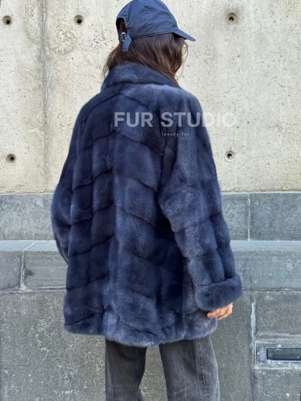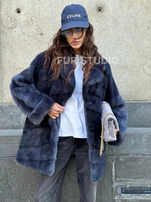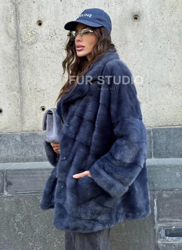 Мех данной шубы аукционная норка, цвет синий. Предлагается в размерах от 42 до 50. Длина модели 70-75 см, что выгодно подчеркивает фигуру девушек. Эта модель идеально подойдет для девушек и женщин, предпочитающих роскошные натуральные меха.
