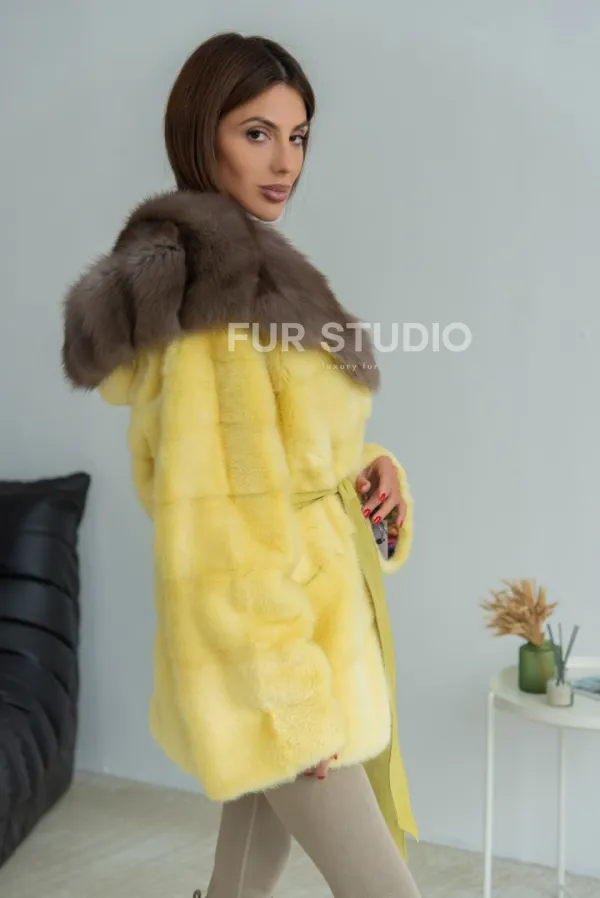 Норковое пончо - шуба с капюшоном из меха куницы - желтого цвета 100415