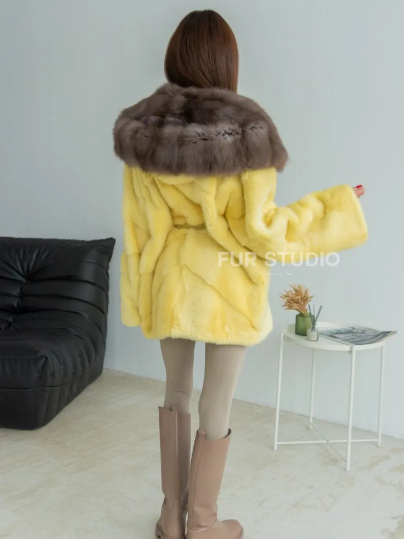 Мех данной шубы аукционная норка , цвет желтый. Предлагается в размерах от 42 до 50. Длина модели 65-70 см, что выгодно подчеркивает фигуру девушек. Эта модель идеально подойдет для девушек и женщин, предпочитающих роскошные натуральные меха.