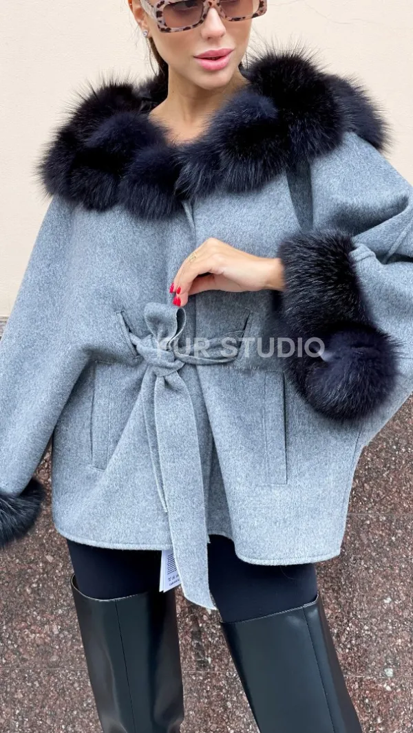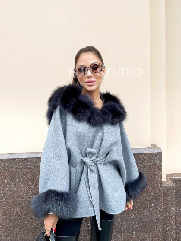 Пончо из натуральной шерсти с капюшоном из песца 100283