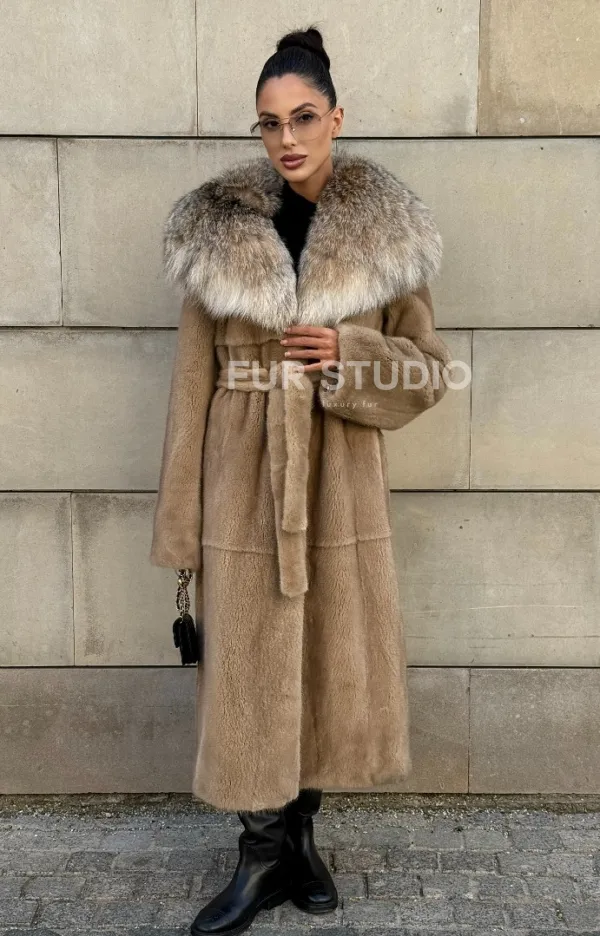 Мех данной шубы аукционная норка, цвет бежевый. Предлагается в размерах от 42 до 50. Длина модели 115-120 см, что выгодно подчеркивает фигуру девушек. Эта модель идеально подойдет для девушек и женщин, предпочитающих роскошные натуральные меха.