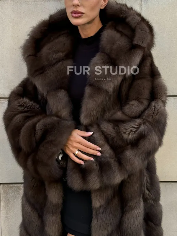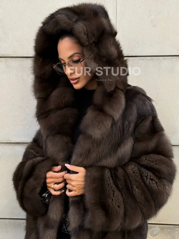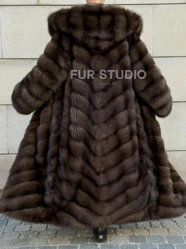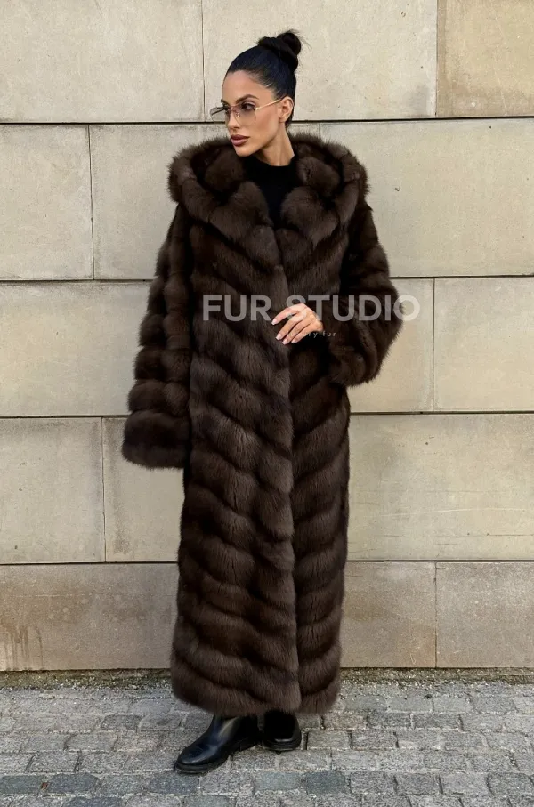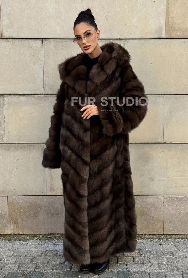 Удлиненная шуба из меха куницы с капюшоном 101056